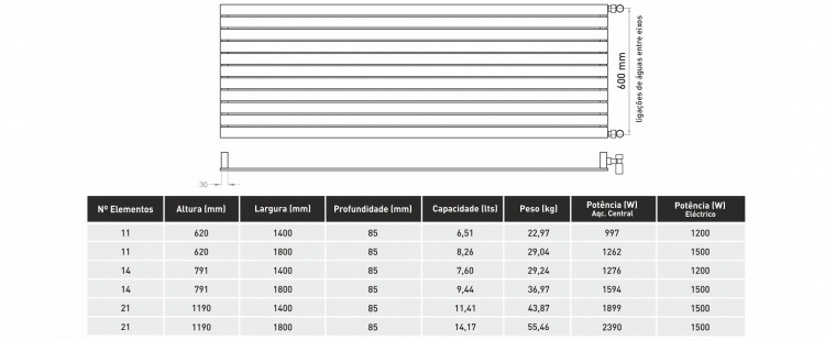 Radiador PLANO horizontal, construído em Aço Carbono (Branco e Forja) e em Inox (Escovado e Polido), segundo a Norma UN-EN442-2 (ensaio de fuga e deformação).