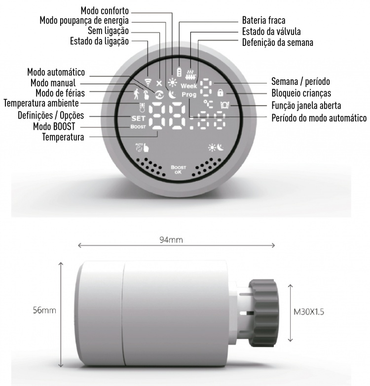 Modos de funcionamento: O termostato dispõe de uma vasta seleção de modos de funcionamento tais como, BOOST, ECO, Conforto, Férias, entre outros.