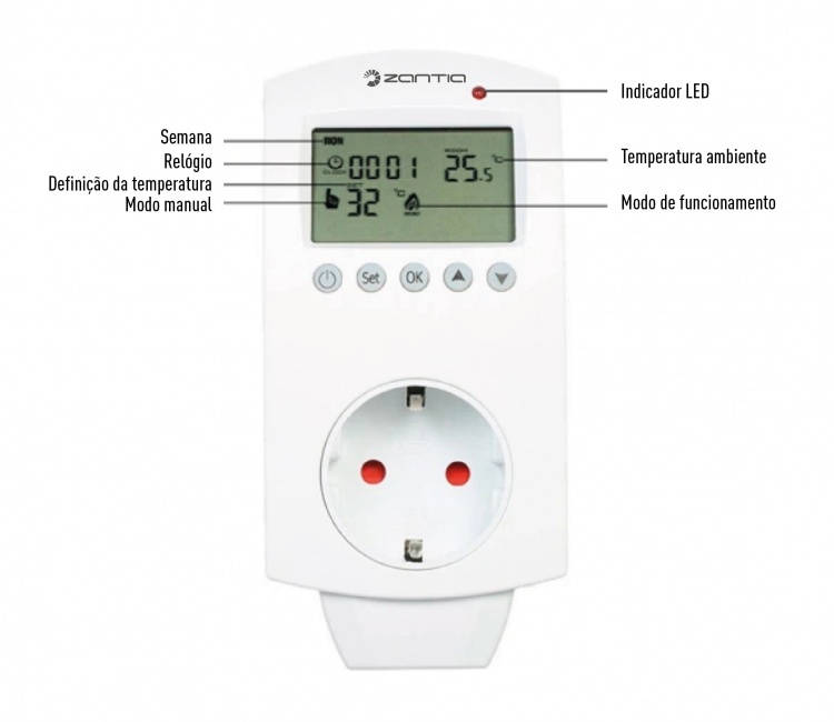 Configuração semanal/horário: Suporta três opções de programação semanal (5+2, 6+1, 7) e seis configurações de horários. Apresenta no ecrã a temperatura atual, a temperatura definida, o dia e a hora.